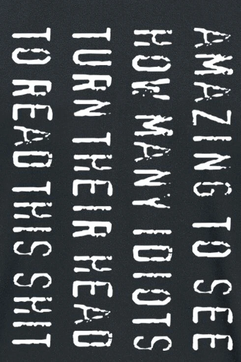 Na komm, gib’s zu: Du hast den Kopf auf die Seite gelegt, um den Frontdruck des Funshirts mit Rundhalsausschnitt zu lesen! Noch nicht? Dann wollen wir dir hier die Sache etwas erleichtern: Schau auch du, wie viele Leute dich plötzlich schräg anschauen, wenn sie versuchen „Amazing to see how many idiots turn their head to read this shit“ zu entziffern.