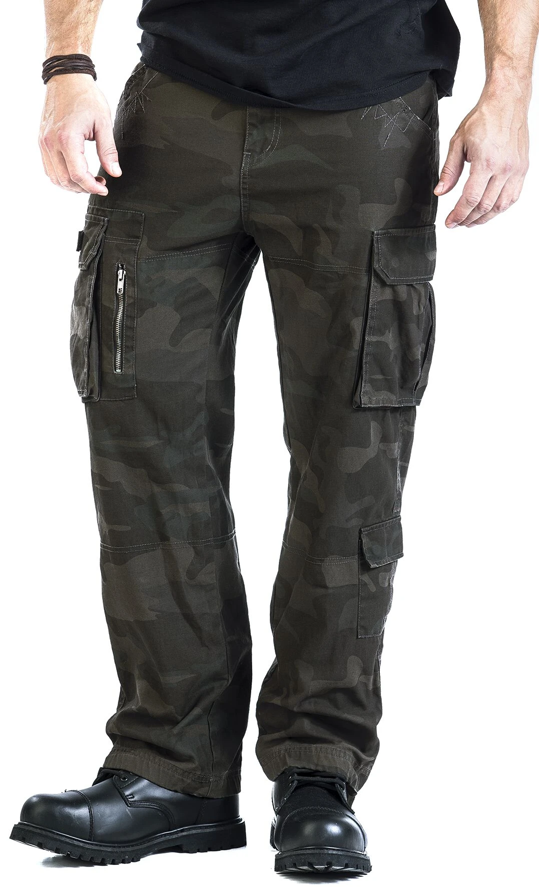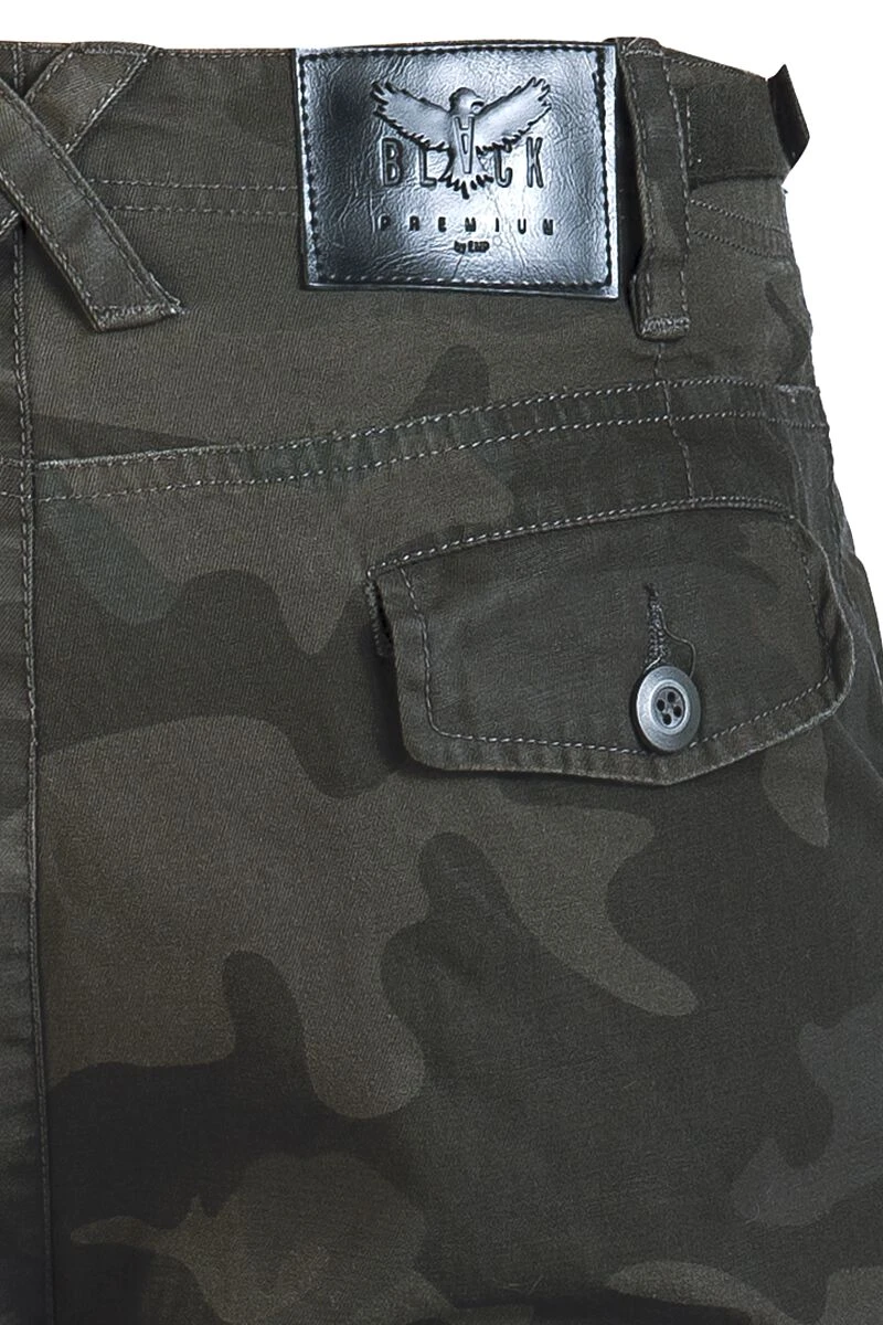 Du möchtest den Camouflage- und Tarnlook tragen, dafür aber nicht extra aufs Schlachtfeld gehen? Dann schnapp dir die Army Vintage Trousers, die in Dark-Camo-Optik gehalten ist. Diese Loose-fit-Herrenhose kommt mit extra vielen Taschen daher. So gesellen sich zu den seitlichen Eingrifftaschen drei aufgesetzte Seitentaschen und zwei Gesäßtaschen. Diese Cargohose mit Hersteller-Patches von Black Premium by EMP ist ideal für Festivals!