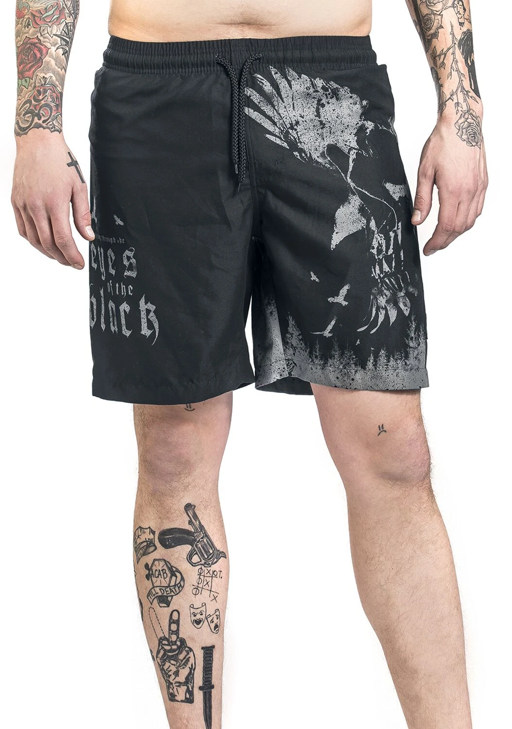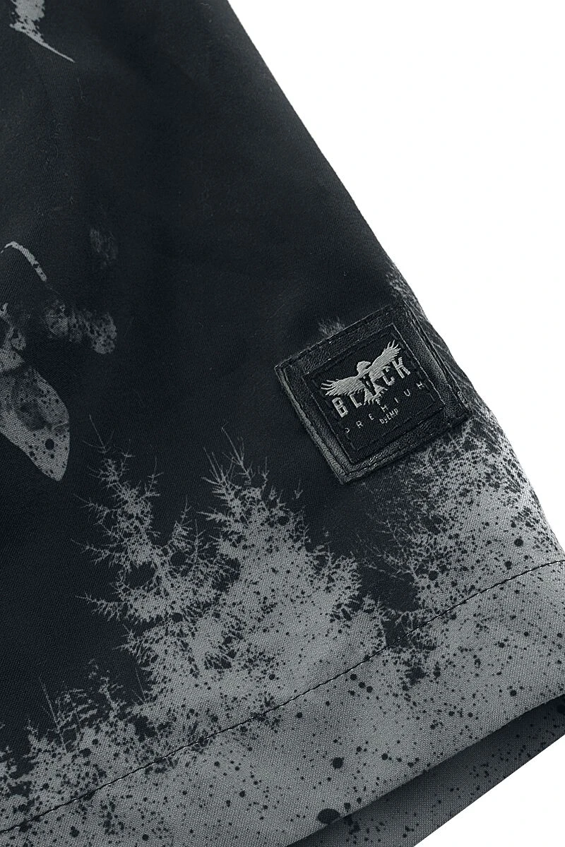 Rocke das Freibad mit den Badeshorts von Black Premium by EMP. Die Badeshorts begeistern sowohl aus praktischer als auch aus optischer Sicht: am rechten Bein ist die Badehose mit dem Schriftzug „Staring Through The Eyes Of The Black“ bedruckt. Auf dem linken Bein prangt ein Totenkopf mit Raben. Tunnelzug und ein Mesheinsatz machen die Badehose besonders gemütlich.