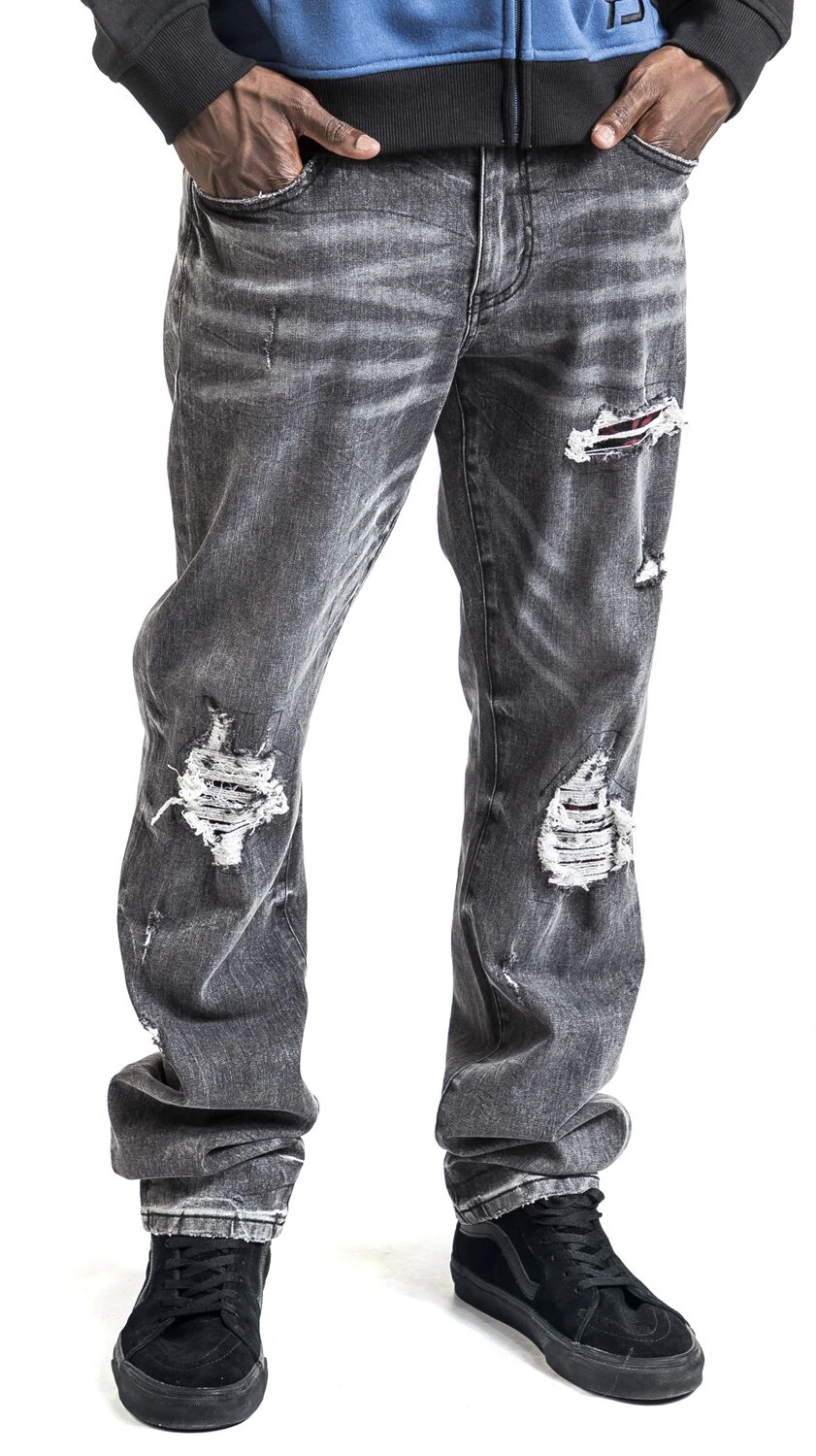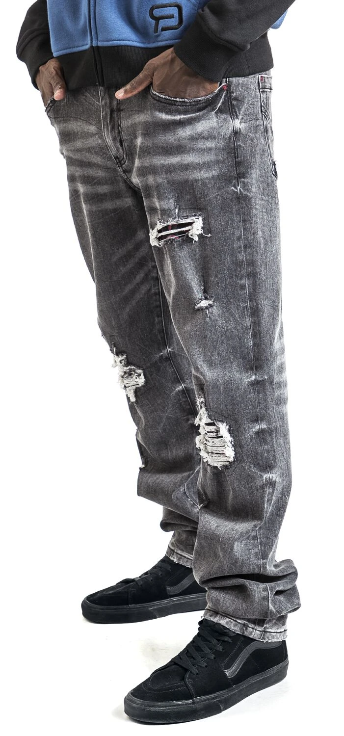 – graue Straight Jeans mit starken Cutouts und Verwaschungen