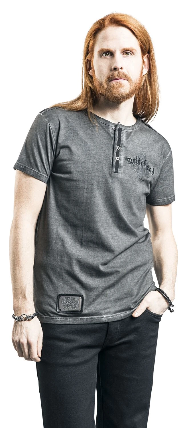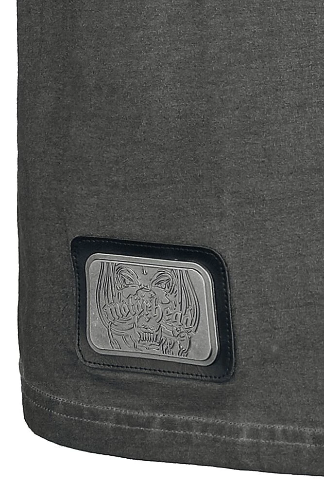 Exklusiv von EMP bekommst du jetzt das geniale Motörhead T-Shirt in Grau aus der Signature Collection präsentiert. Das Shirt ist mit einem bedruckten Necktape und im Vintage-Style gearbeitet. Ein Schulterriemen mit Knopf und eine Knopfleiste sind optisch auffällige Details. Ein Kunstlederpatch mit Metall-Logo vorne, die frontalen und rückseitigen Prints sowie die bestickte Vorder- und Rückseite sind die Highlights.
