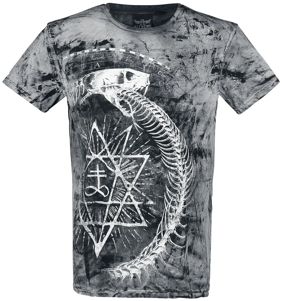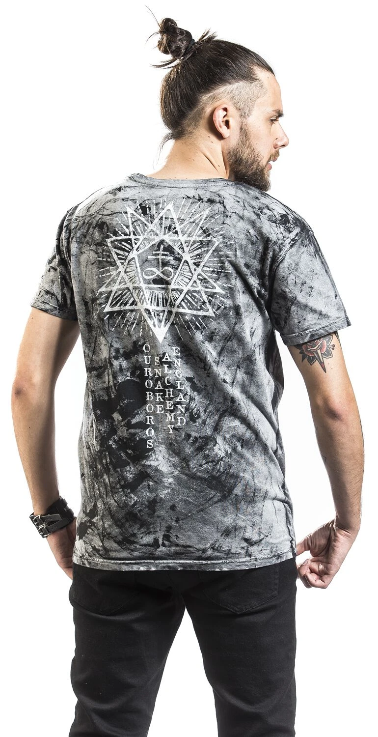 Mit dem Alchemy England Ouroboros Snake Shirt, sicherst du dir ein Oberteil mit besonders auffälligem Design. Der Frontprint zeigt die Ouroboros Schlange, ein Symbol des alten Ägyptens das eine Schlange darstellt die sich in den eigenen Schwanz beißt. Passend dazu ist auch die Rückseite mit okkulten Symbolen bedruckt. Der Washed-Look unterstreicht das wilde Design des Shirts.