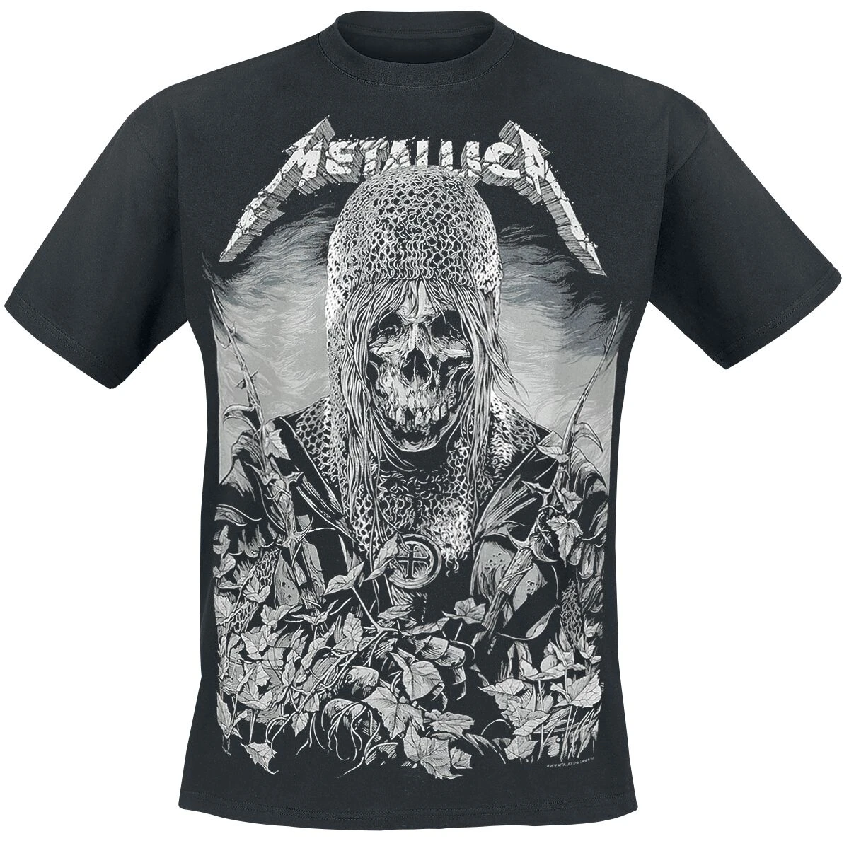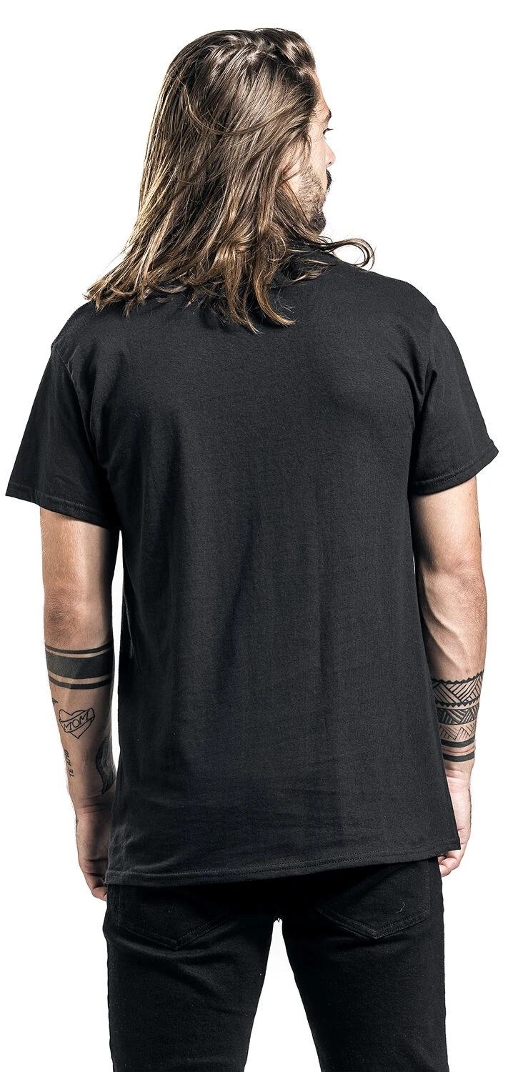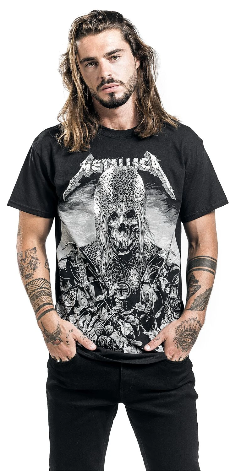 Ein Muss für Metallica-Fans ist das „Templar“-T-Shirt. Wie Du bereits erahnen kannst, ist auf der Front des schwarzen Bandshirts ein Templer im Skull-Style abgebildet. Das Besondere an dem Druck ist, dass er silbern glänzt. Über dem detaillierten Print kommt der Bandname optimal zur Geltung. Im Rücken bleibt es unifarben Schwarz.
