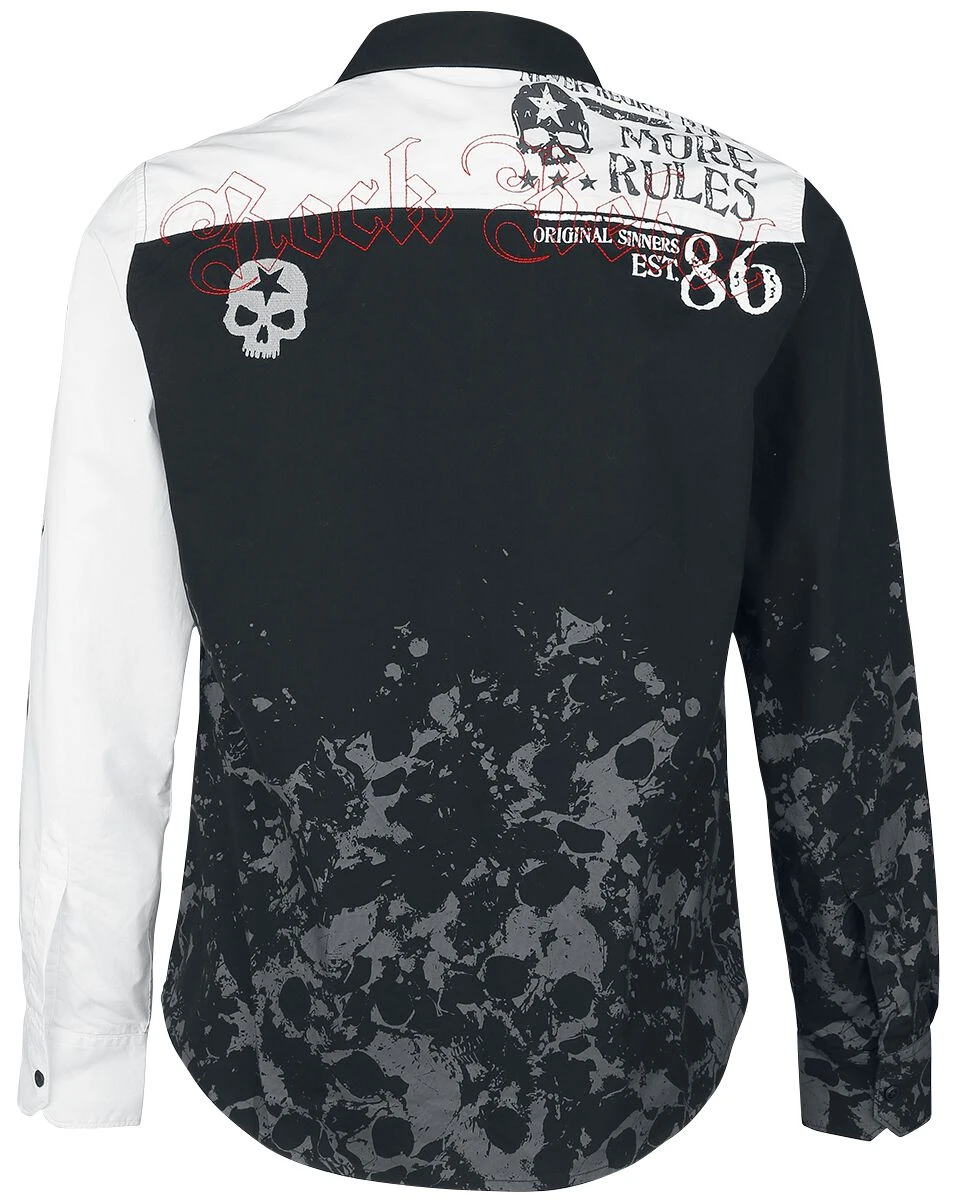 Gönne dir ein Hemd zum Ausgehen von Rock Rebel by EMP mit dem „There Is No Business Like Rock Business“ in Schwarz und Weiß. Das kühlende Baumwollgewebe ist mit zahlreichen Prints auf Vorder- und Rückseite sowie auf den Ärmeln gearbeitet. Stickereien auf Front und Rücken sowie Manschettenärmel sind Highlights des Hemdes.